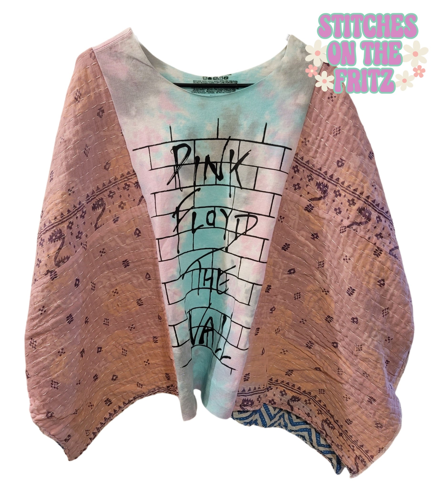 This beautiful handmade top is made with new tee and kantha cotton fabric for the sleeves.  This is larger in size and will fit plus size too.  It measures 25 inches in length.  There are sleeves so only open at the bottom.