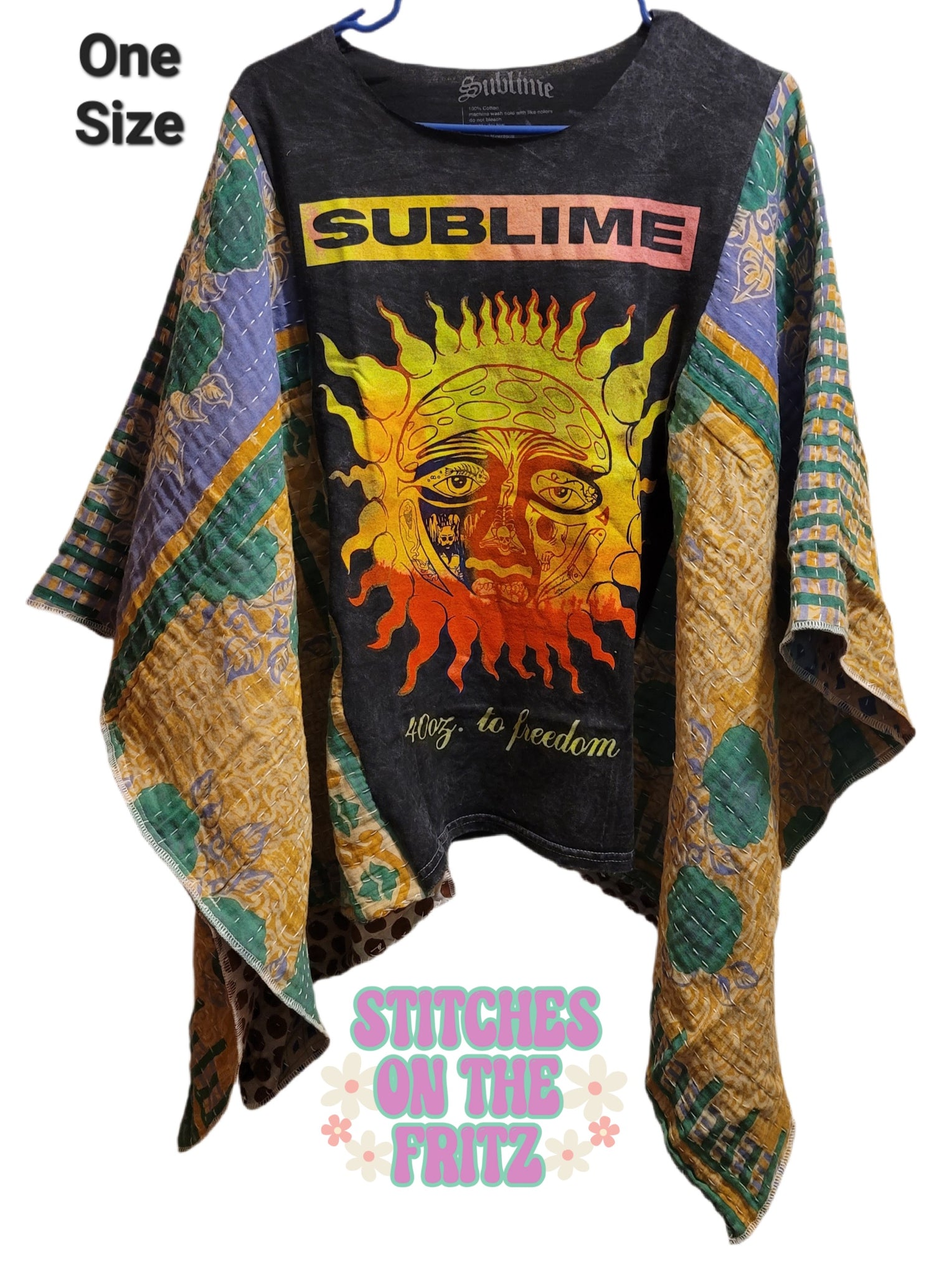 This beautiful handmade top is made with new tee and kantha cotton fabric for the sleeves. This is larger in size and will fit plus size too. There are sleeves so only open at the bottom.