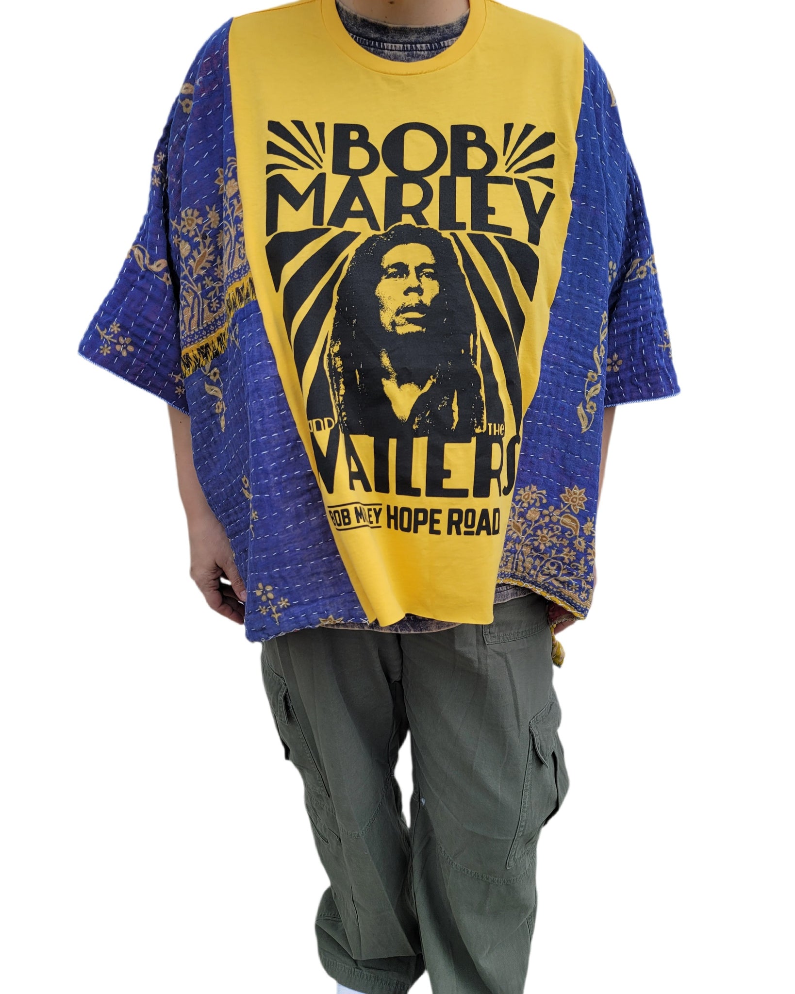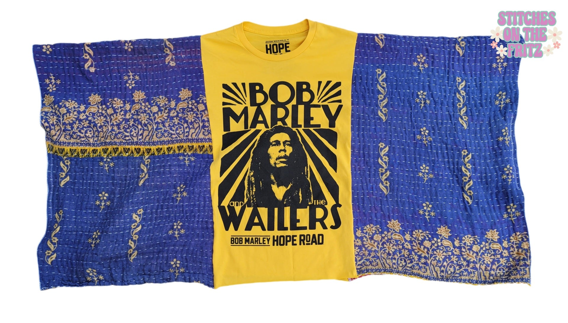 beautiful handmade top is made with new tee and kantha cotton for the sleeves. This is larger in size and will fit plus size too. There are sleeves so only open at the bottom. This top is 46 inches across chest and 25 inches in length.