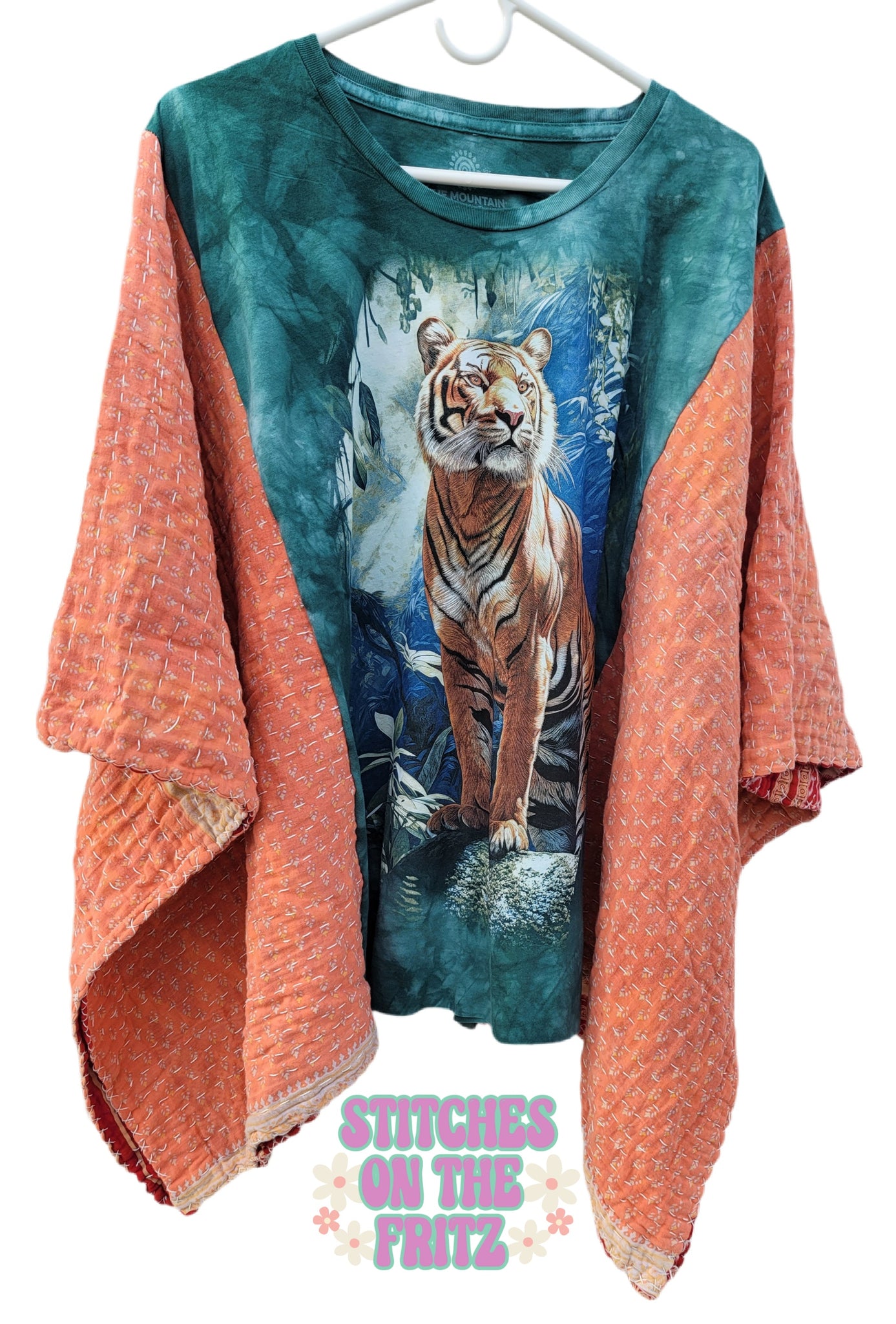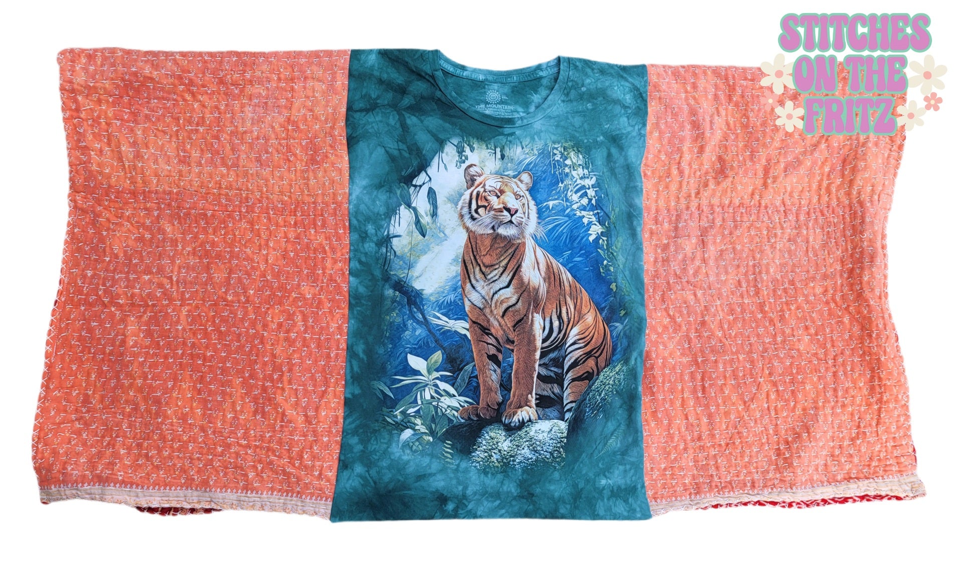 This was handmade using a new tee and prewashed kantha. This top will fit uo to 3xl. Sleeves are closed most of the way. Cute little patch on the back. Beautiful top!