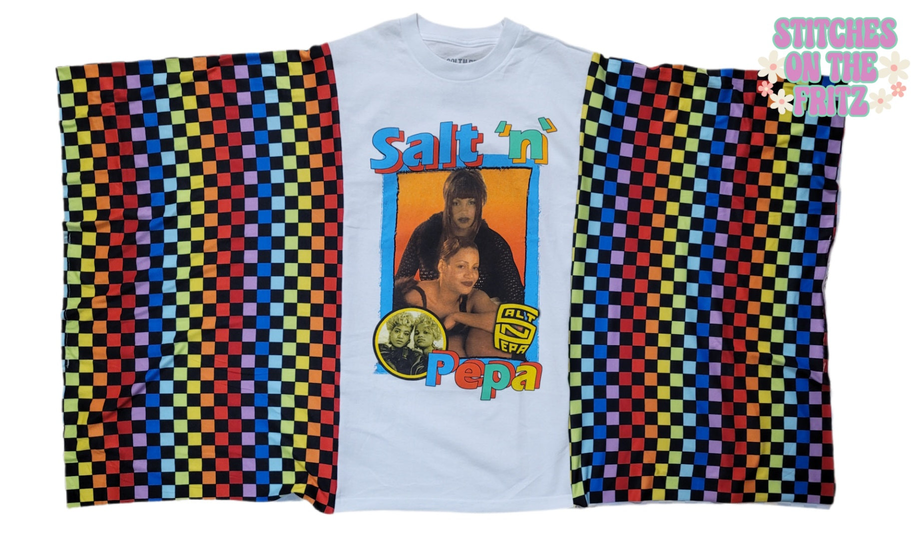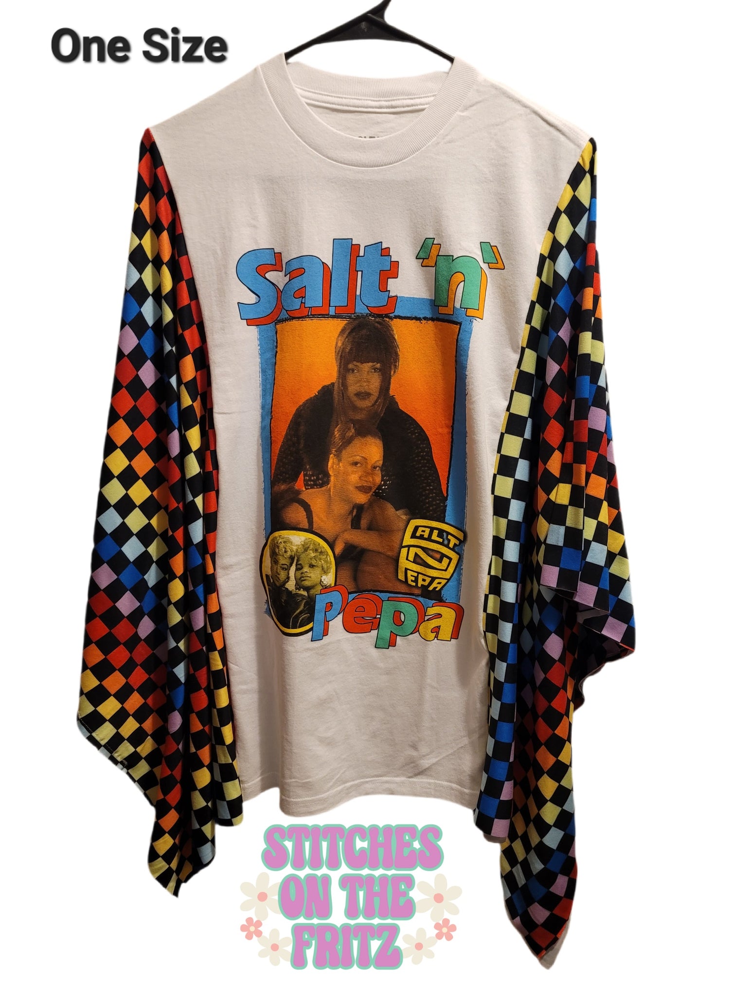 This was handmade by me with a new tee and prewashed double brushed polyester knit fabric for the sleeves. The sleeves are closed not completely open. This top measures 45 inches across and 27 inches in length. Back has no hit just plain white.