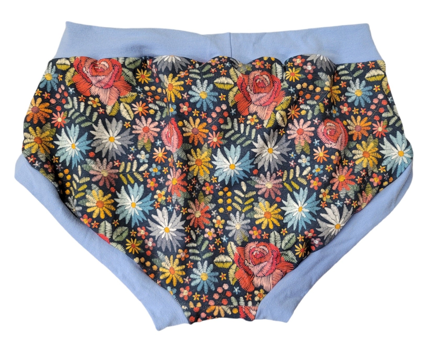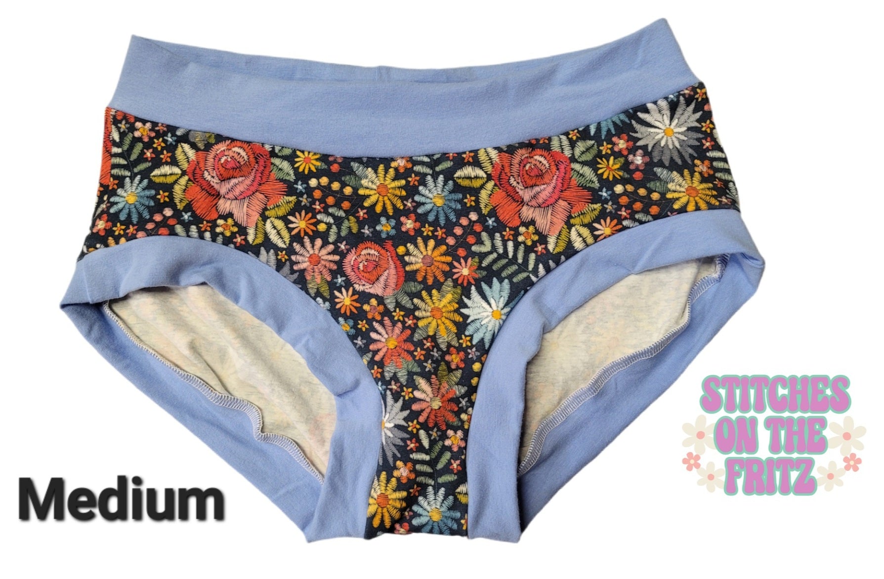 These handmade underwear are made with prewashed cotton spandex knit fabrics. Waistband measures 12.75 inches across.  No elastic just soft stretchy knit bands.  Crotch is lined.