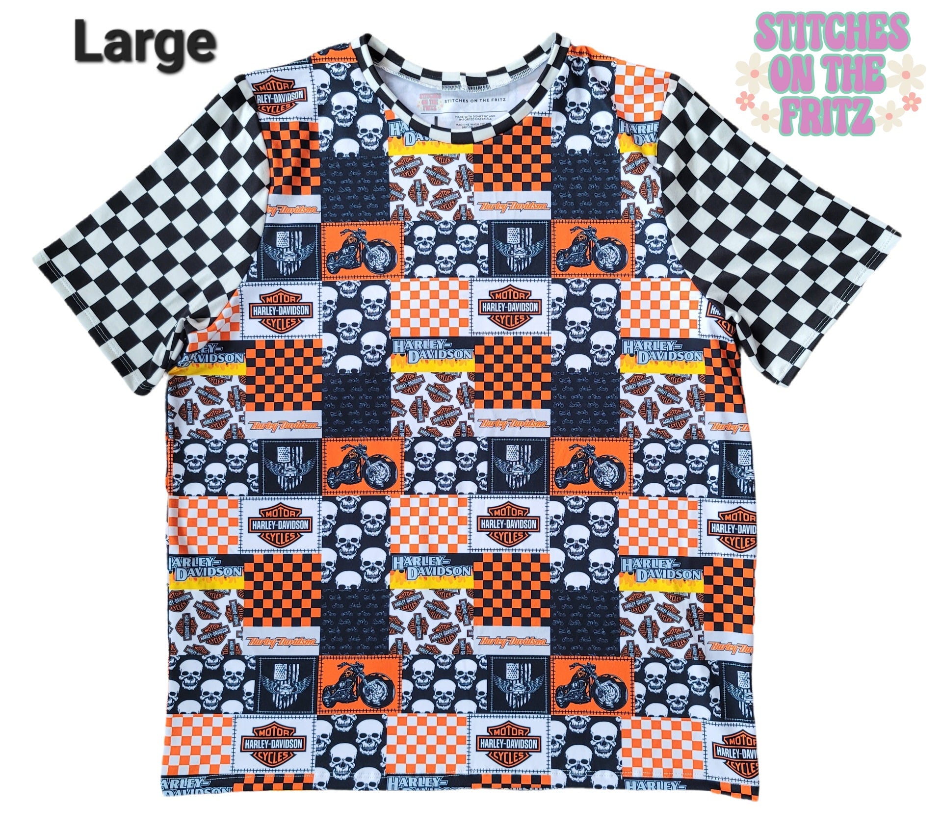 This cool handmade tee is made with prewashed double brushed polyester knit fabric.  This tee measures 23 inches across chest and 29 inches in length.  This is a unisex style fit.  The sleeves are a little more off white then what is on tee but still cool!