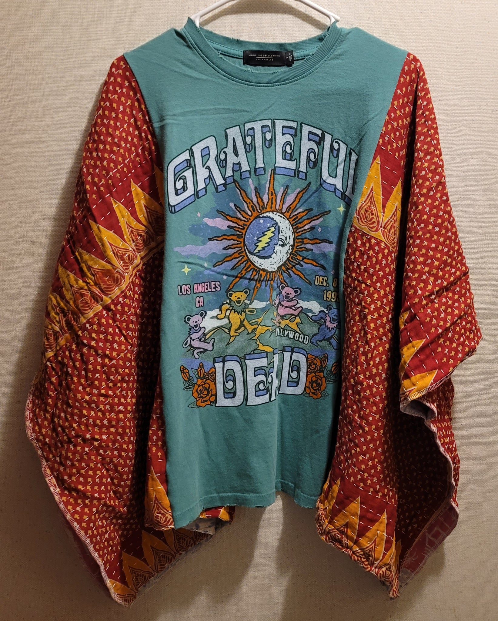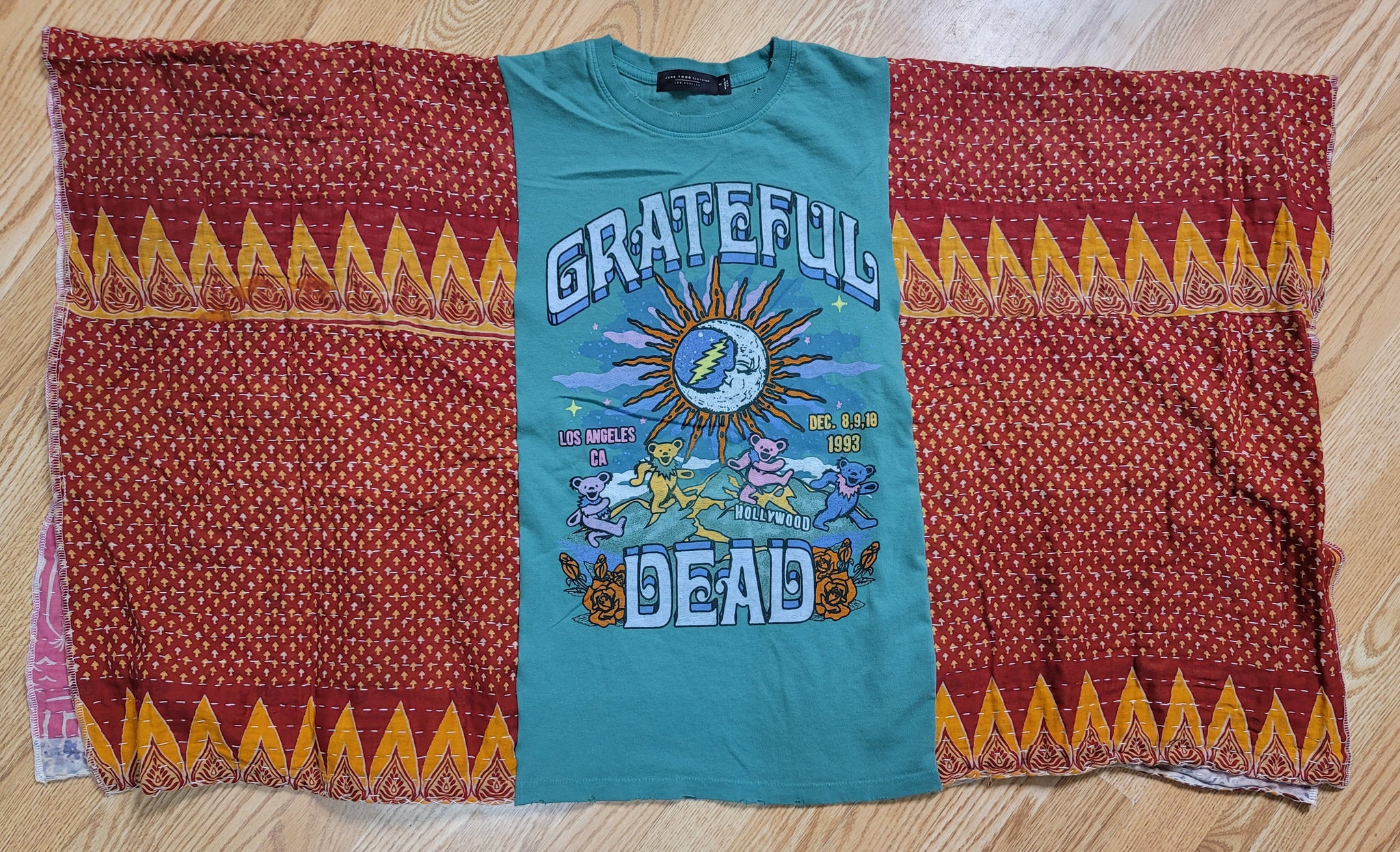 beautiful handmade top is made with new tee and kantha cotton fabric for the sleeves. This is larger in size and will fit plus size too. It measuresdata:text/mce-internal,rte__editor,This 25 inches in length. There are sleeves so only open at the bottom.